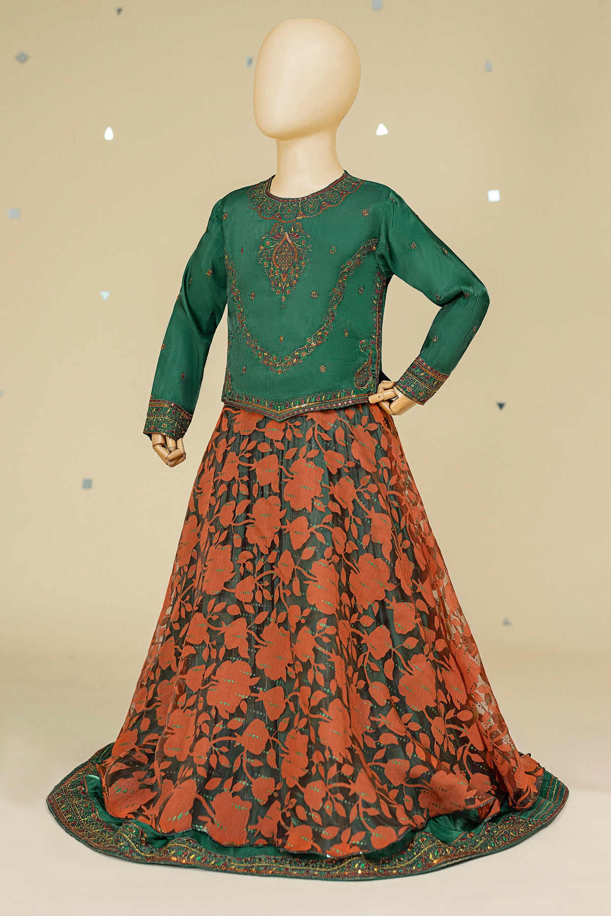 Green color lava silk lehenga on top orange color jacquard fabric on glitter print